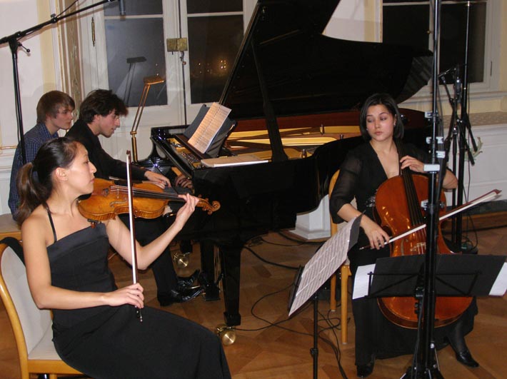 Das Programm des Leibniz-Trios wies Vertrautes, aber auch Überraschungen auf. Man begann mit dem C-Dur-Trio von 1797 von Joseph Haydn, eine Komposition, die wie für das Leibniz-Trio geschaffen schien: ein sehr verspielter, vertrackter und etwas dominanter Klavierpart und energische Linienführung in den Streicherstimmen. Das Leibniz-Trio legte Haydns Werk leicht und fließend an und strahlte dabei Souveränität und spielfreude aus. Das finale presto gelang den jungen Musikern leidenschaftlich und höchst virtuos.